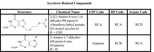 Acyclovir is a white crystalline substance. It is an orally administered agent used for the treatment for the treatment Herpes Zoster infections, genital herpes and chickenpox. Acyclovir is insoluble in water and most organic solvents, very slightly soluble in alcohol and somewhat soluble in DMSO. It is soluble in water at alkaline pH due to salt formation (pKa= 9.3, for ionization of the guanine OH and pKb=2.3 for protonation of guanine nitrogen, (see C. Hansch, et al, Comprehensive Medicinal Chemistry, Vol.6, New York, Pergamon Press 1990). Its log P has been reported to be -1.59 (http://www.ncbi.nlm.nih.gov/pmc/articles/PMC2167972/).Acyclovir is relatively inert to acid and base (see Stability Studies). LD50 of Acyclovir has been reported (mice > 10,000 mg/kg oral; 1000 mg/kg ip, see the Merck Index, 12th Edition, 1996).