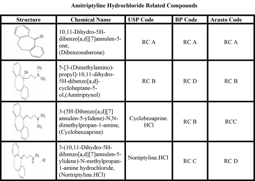 Amitriptyline related compound B: NMT 0.15% Nortriptyline: NMT 0.15% Cyclobenzaprine: NMT 0.15% Any individual unspecified impurity: NMT 0.10% Total impurities: NMT 1.0% |