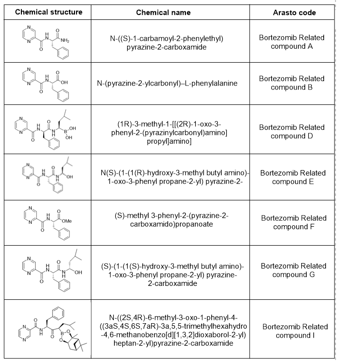 Bortezomib Related Compound B: NMT 0.1% Bortezomib Related Compound D: NMT 0.1% Bortezomib Related Compound E: NMT 0.1% Bortezomib Related Compound F: NMT 0.1% Bortezomib Related Compound G: NMT 0.1% Bortezomib Related Compound I: NMT 0.1% Any unspecified impurity: NMT 0.1% Total impurities: NMT 0.5% |